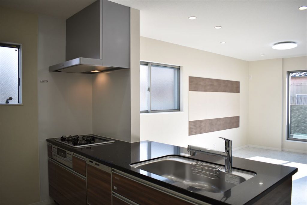 ●対面式システムキッチンから奥へと広がるリビング・ダイニングは南向きの明るい空間。
