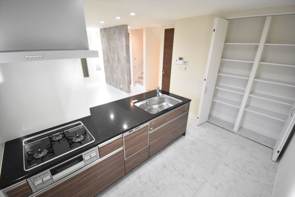 壁面には、買い置き食材がたっぷり収納できる大容量のパントリ―も備えています。