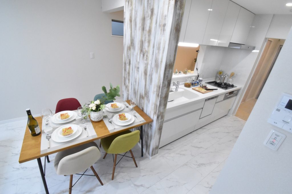 ダイニング、キッチン、洗面室、浴室を真横に配置した、家事動線の取りやすい間取りなのもこちらモデルハウスの特徴です。