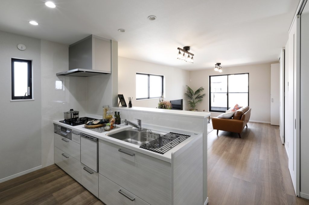 浴室や洗面室などの水回りをすべて1階にまとめ、2階の全スペースをLDKとしたため、広々としたリビングでのびのびくつろげる大空間に。