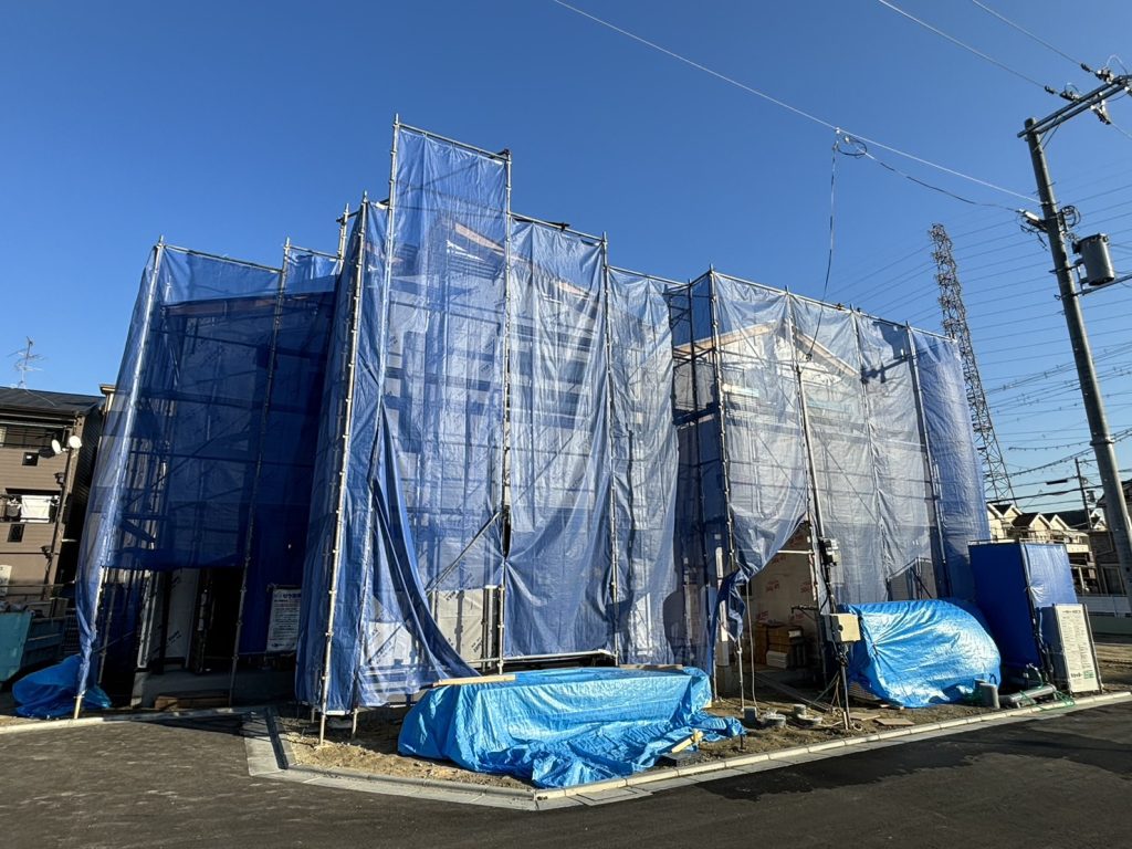 養生シートに覆われているため中の様子はわかりにくいのですが、屋根や外壁が出来上がっているのがお分かりいただけますでしょうか。