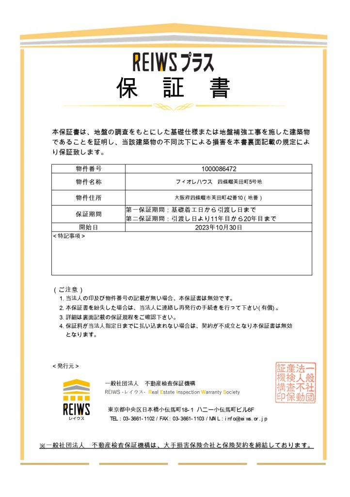 フィオレハウスは「REISプラス」を採用しており、マイホームのお引渡し時には次のような保証書をお渡ししています。