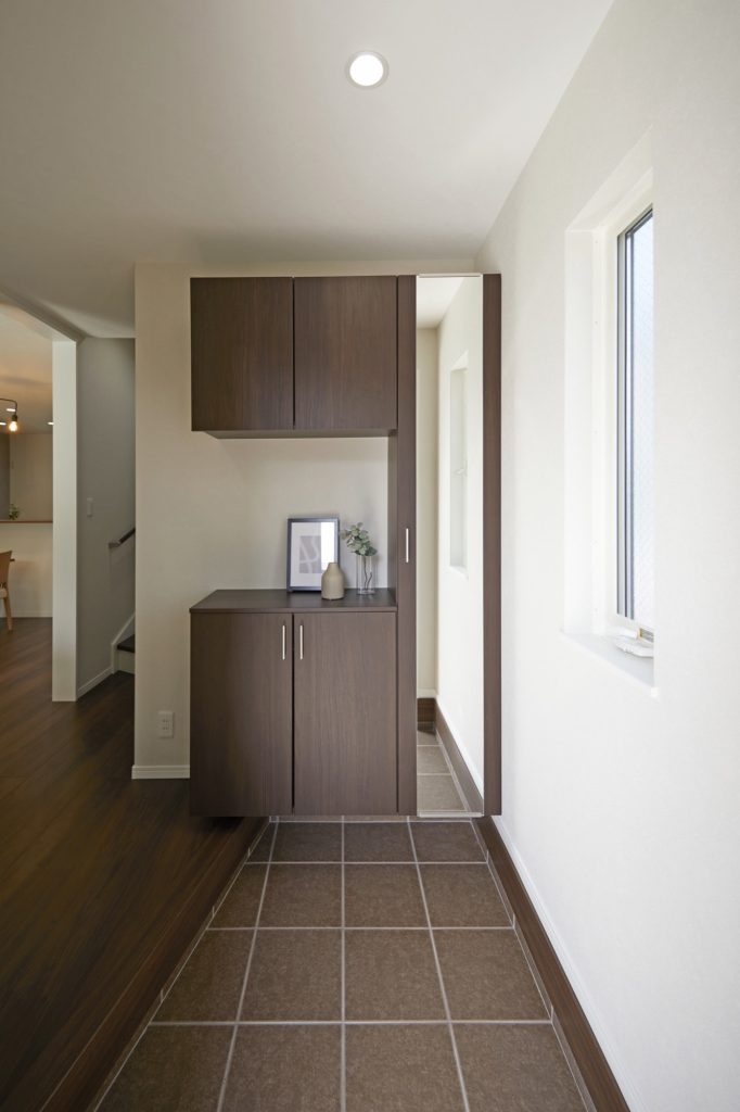 玄関は、シューズボックスや床材をダークブラウンでまとめて上質な雰囲気に。