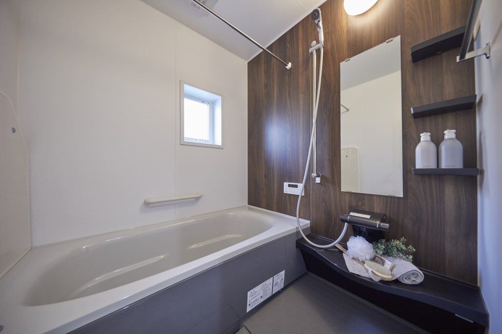 ダークブラウンの木目調パネルで、リラックス感を高めた浴室。