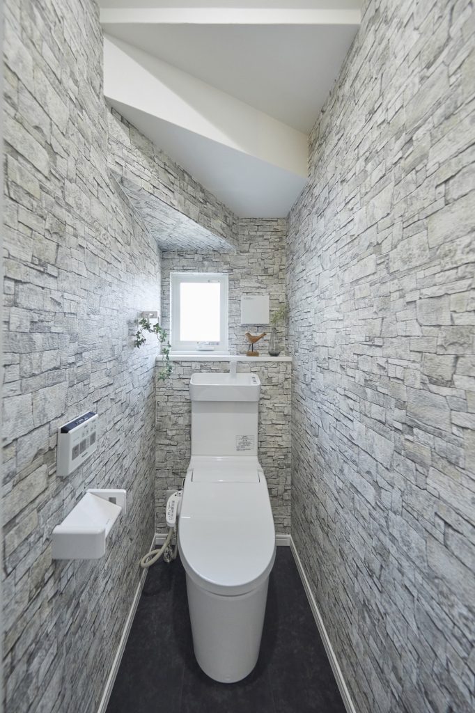 石を積み上げたようなクロスで、洞窟のようなおこもり感を演出した階段下のトイレ。