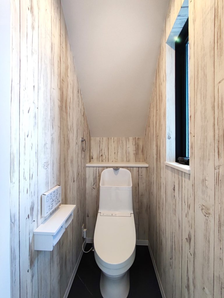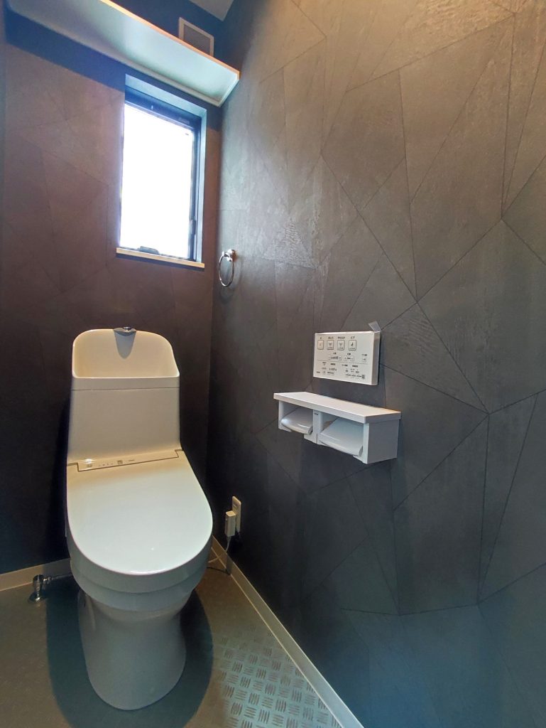 2階のトイレはイメージを変えて、落ち着いて過ごせるようシックな雰囲気にしています。