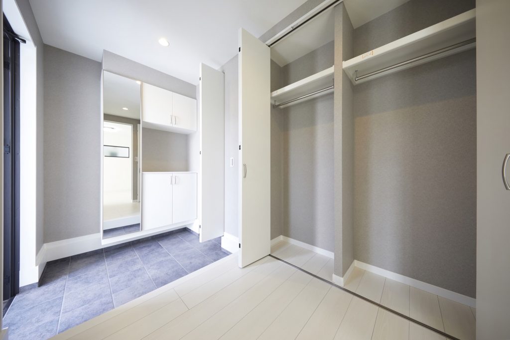玄関ホールには、たっぷり収納できるクローゼットを設置。家族分のコートやジャケット、バッグ・ストールなどをまとめて収納できます。リビングと玄関をつなぐ動線上に設けているので、朝の身支度も帰宅後の片付けもスムーズです。