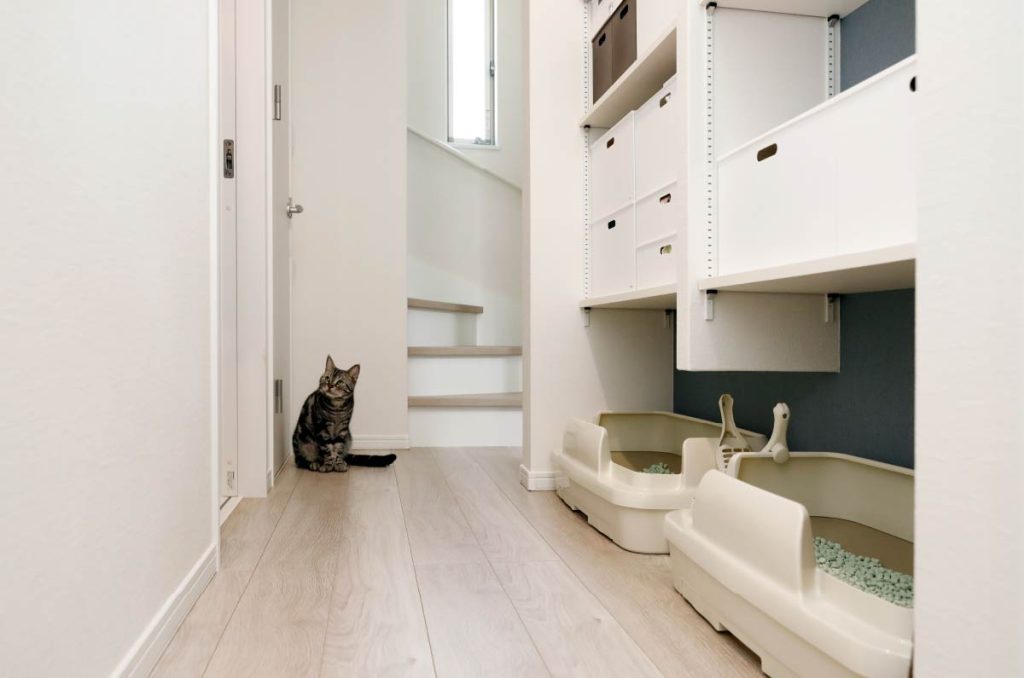 廊下に設けた収納の下を、ペット用のトイレスペースにするアイデア。