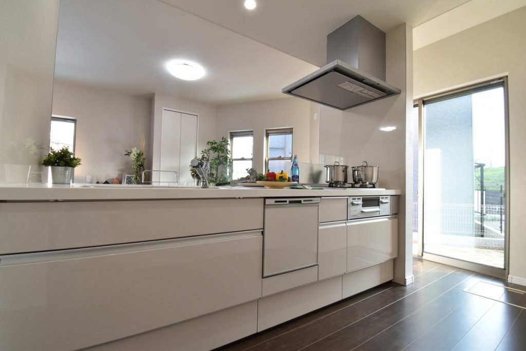 ●とても明るいキッチンスペースには、食器洗い乾燥機、浄水器、ガラストップコンロなど、使い勝手の良い設備を備えました。