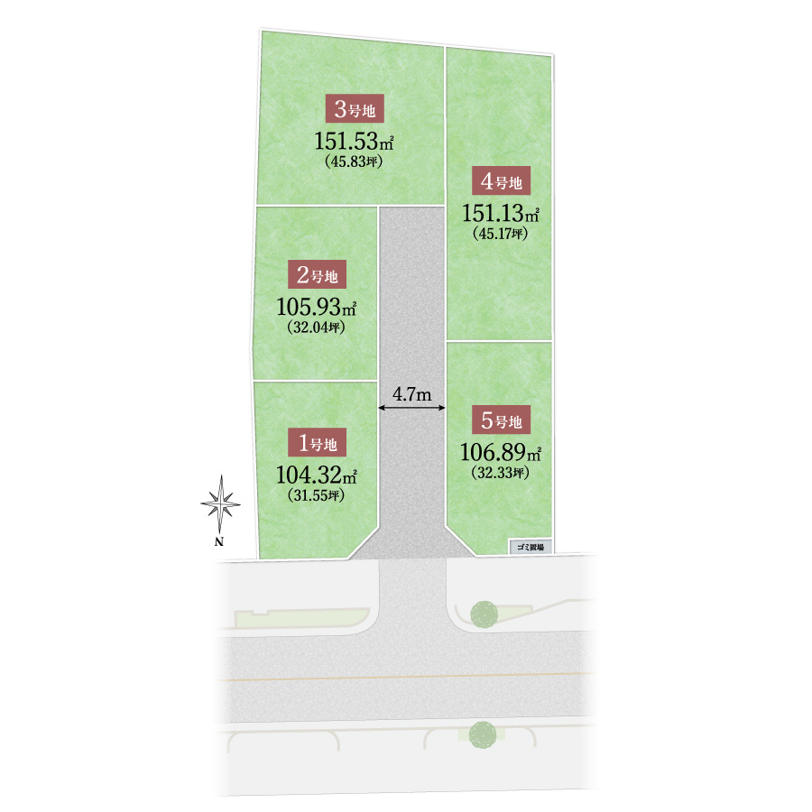 すべての区画が敷地面積100m²(約30坪)を超えており、ゆとりのあるプランニングが可能です。
