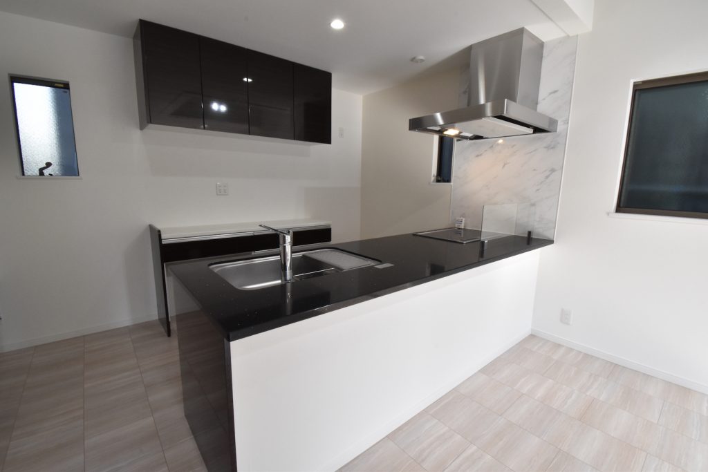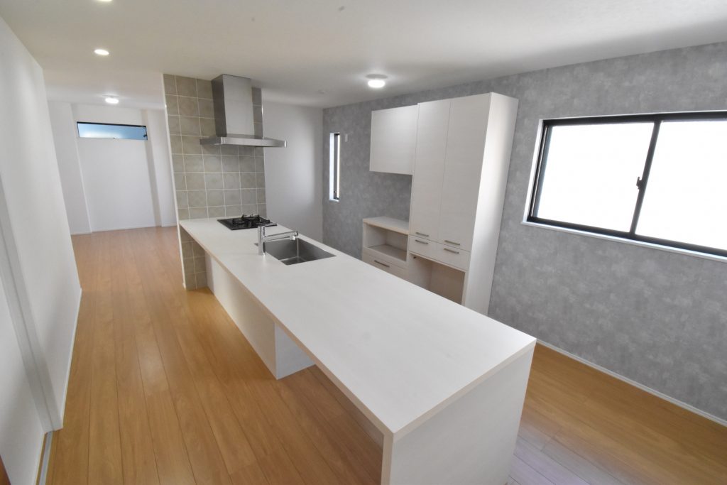 アイランドキッチンのような開放感がありつつも、片側が壁付けになっているため油などが飛び散りにくくなっています。