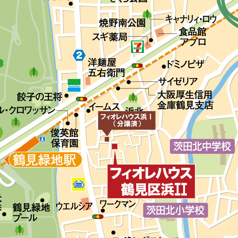 周辺には、スーパー、ドラッグストア、コンビニなどがすべてそろったフィオレハウス鶴見区浜Ⅱ。