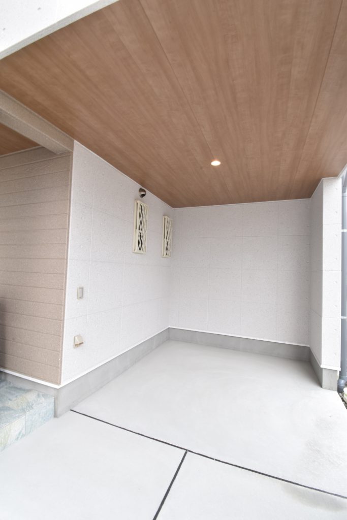 ブラウンの外壁と、木目調の玄関ドアに合わせて、ガレージの天井を木目調に仕上げてあるのがポイントです。