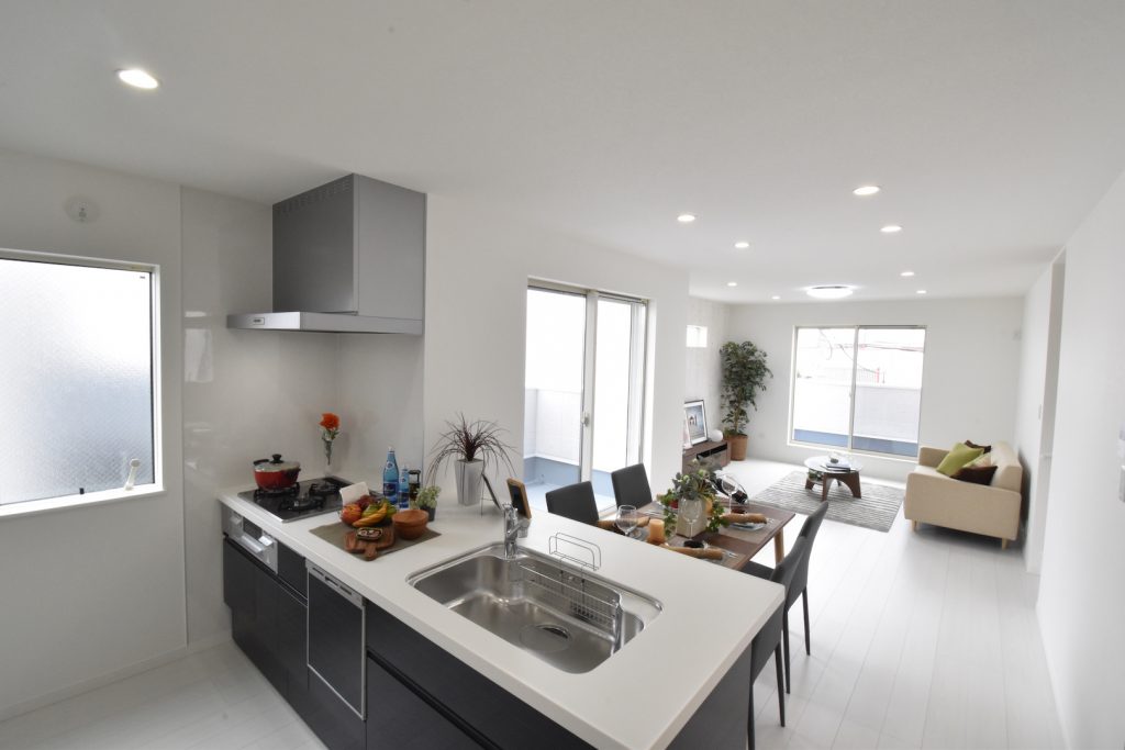開放感たっぷりのオープンキッチンを採用した広がりあるLDKは、バルコニーに面した大きな掃き出し窓から一日中日が降り注ぐ明るい空間です。