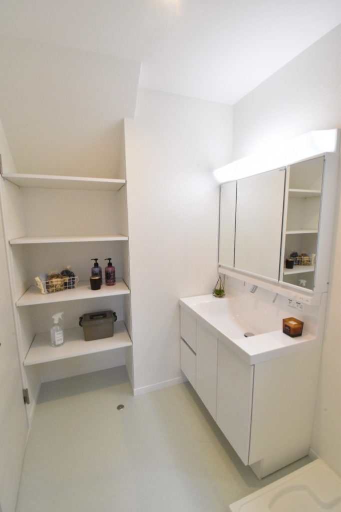 洗面化粧台からすぐに手が届く位置にリネン棚を配置してあるため、洗面室内での動きが少なくてすみます。