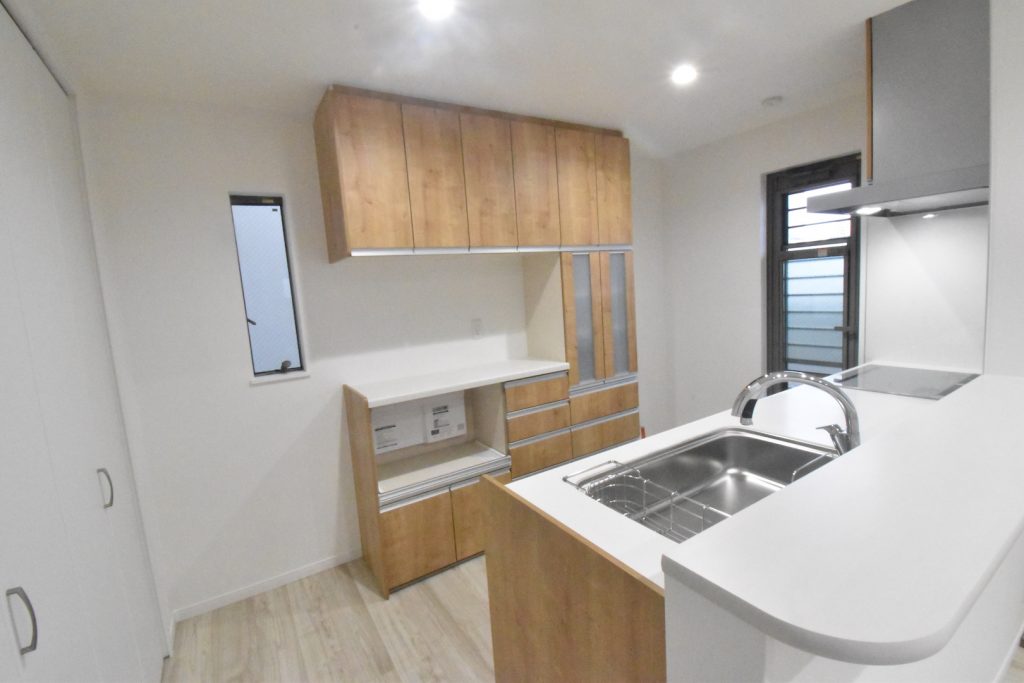 同じ木目柄のカップボードをコーディネートして、まるで自然の中にいるような居心地の良さが魅力のナチュラルで暖かみのあるキッチンになりました。