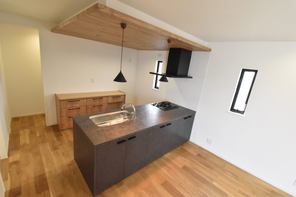 まず2階にLDKを配置して、明るい空間にしたいなと思いました。それから、内装は本杢の温かみのあるフローリングにして、天井高を上げつつもキッチン上部は折り下げ天井にして、おしゃれなペンダントライトを取り付けました。カップボードもお気に入りです。