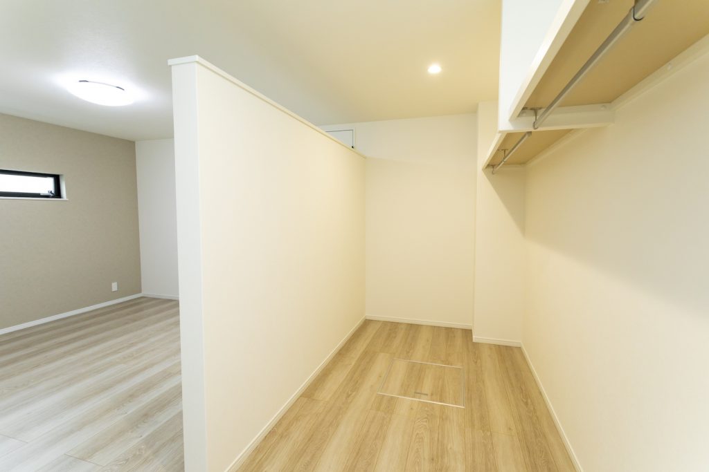 こちら洋室に設けた収納スペース。あえて建具をなくすことで予算を抑えることにもなりました。