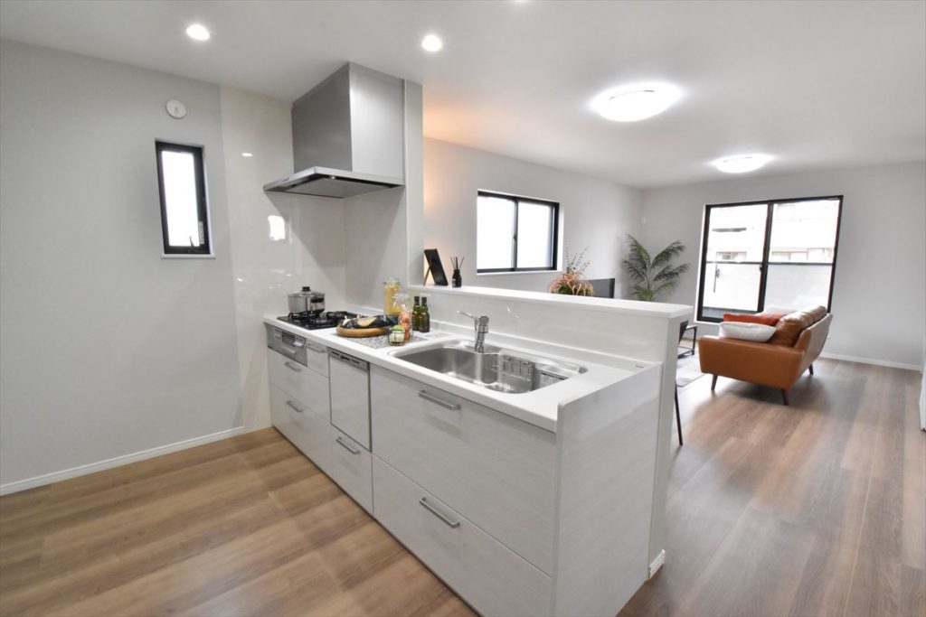 憧れの食洗機付きのホワイトキッチンはじめ、トイレや洗面化粧台などの設備機器や内装もすがすがしく清潔感のある白でまとめました。
