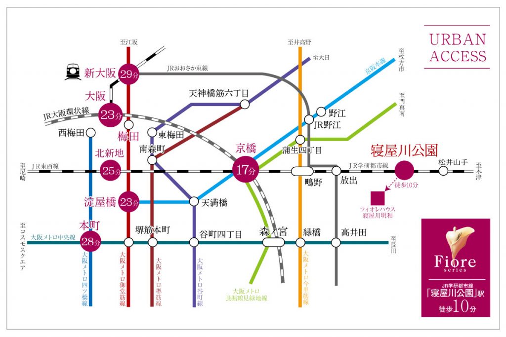 JR学研都市線の区間快速停車駅「寝屋川公園」駅へは徒歩10分で、「京橋」駅へは乗車17分。