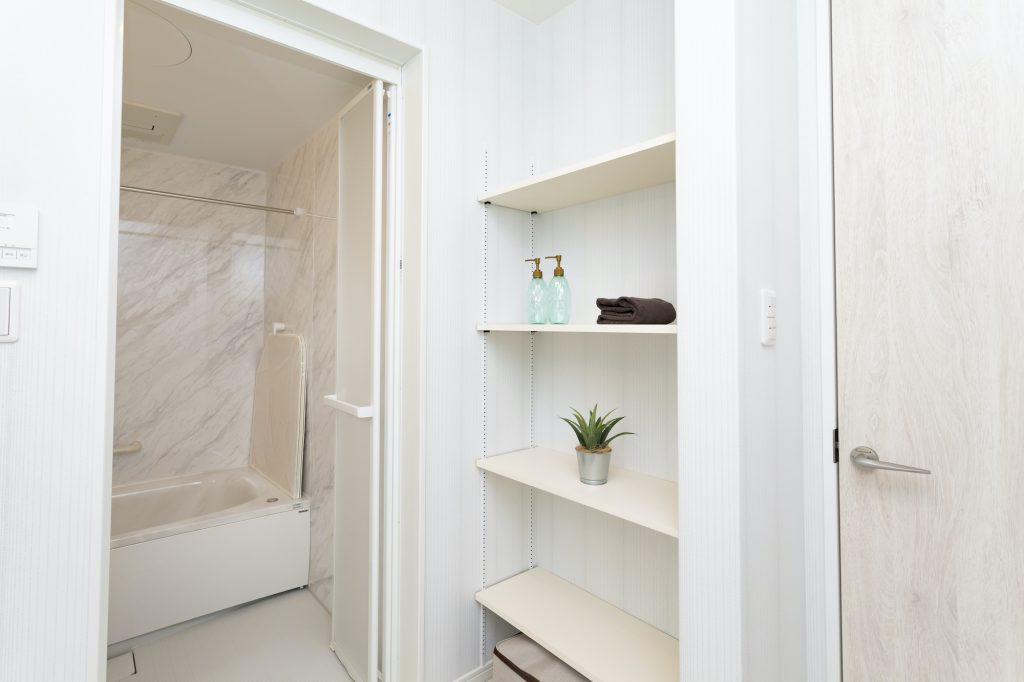 特に、バスルームのすぐ横に設けておけば、お風呂から上がってサッとバスタオルが取り出せるのはもちろん、シャンプーやボディソープなどを切らしてしまったときも、バスルームから手が届きます。