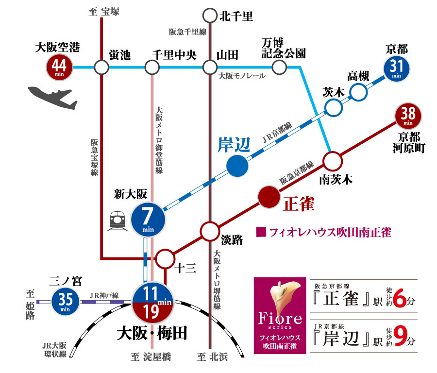 「正雀」駅からの阪急京都線は、梅田へのアクセスがいいのはもちろん大阪メトロ堺筋線に相互乗り入れしており、日本橋・難波方面への通勤・通学にも大変便利です。