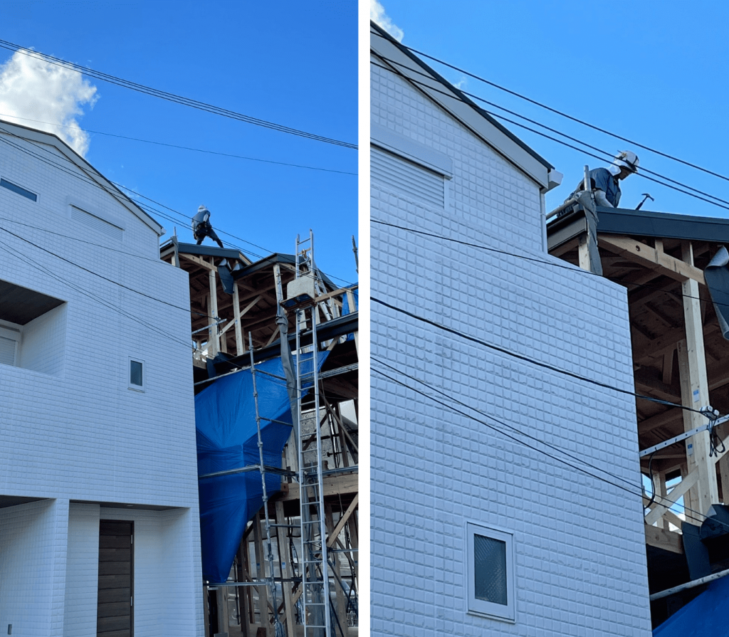 屋根の上で軽々と作業をしていますが、建築現場は常に危険がともなうので、注意喚起しながら安全第一で工事を進めています。
