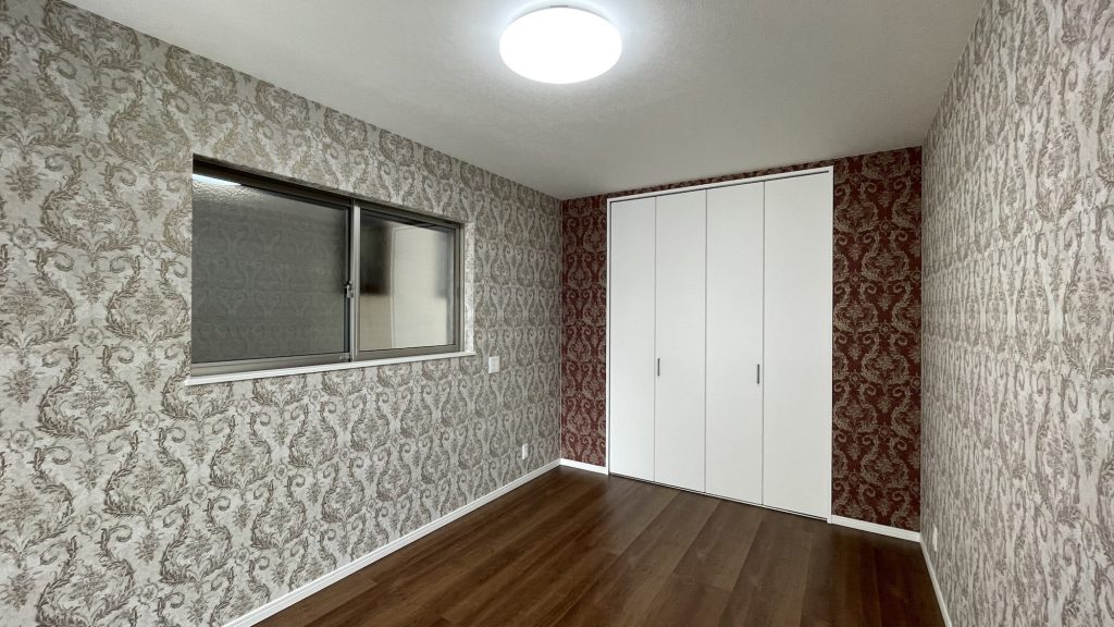 ゴージャス感のあるクロスを全面にあしらった洋室。