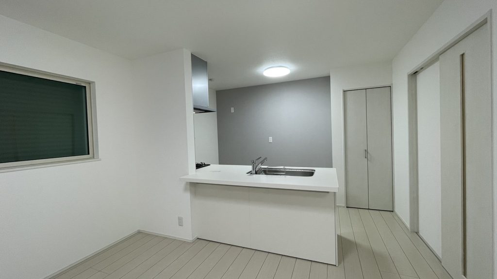 キッチン背面のグレークロスがさりげなく空間のアクセントになって、とってもおしゃれです♪