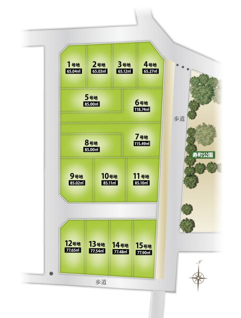 こちらは、南西角からの分譲地風景。右奥に広がるのは寿町公園です。