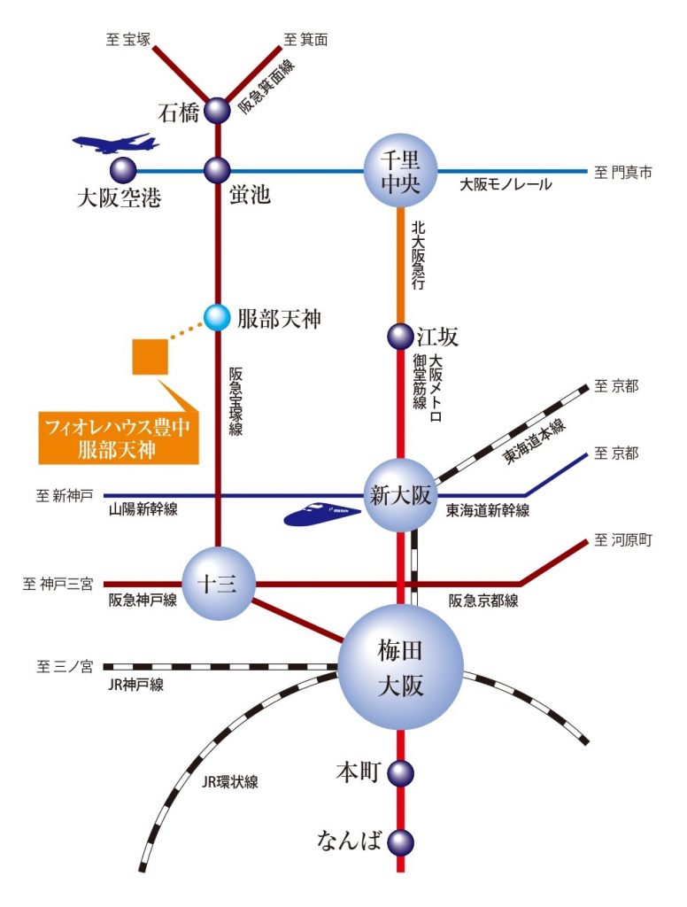 阪急宝塚線「大阪梅田」駅まで、わずか5駅12分と大阪都心部への通勤がラクラク。