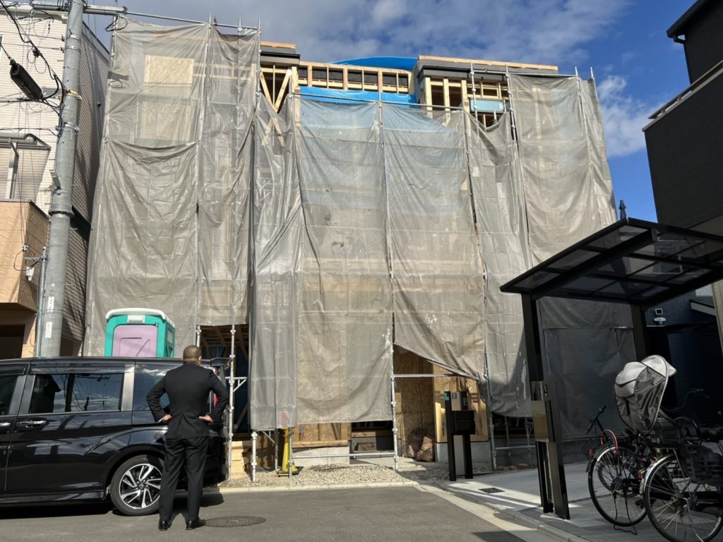 その後、防犯・雨除けのために、建物をシートで丁寧に覆ってこの日の作業が完了しました。