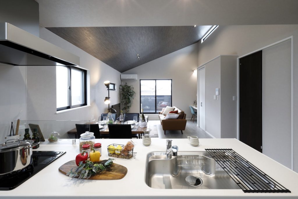 ワークトップ部分を広めにとった対面キッチンからは、リビング全体を見渡せます。