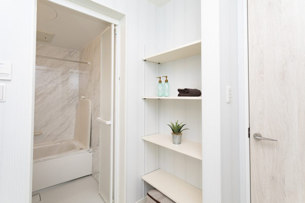 洗面室の可動式のリネン庫は、お風呂上りにバスタオルがすぐに手に取れるように、あえてオープンスペースにしています。