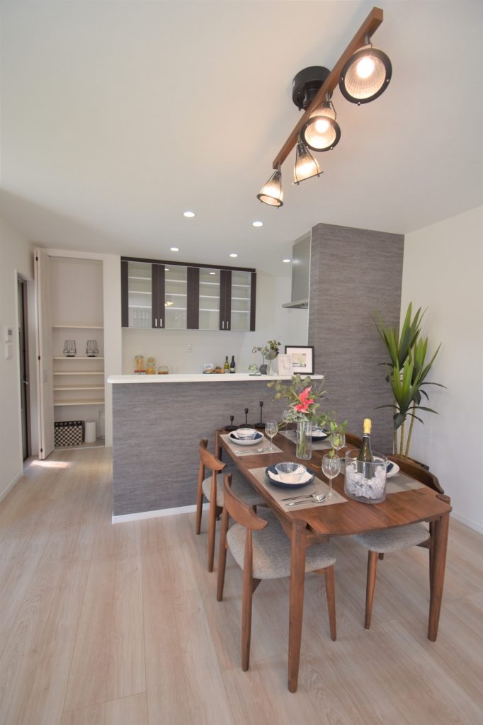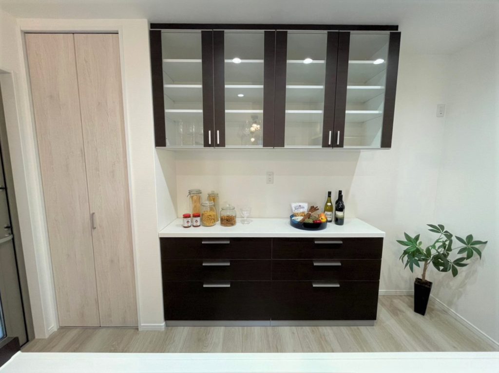 3号地モデルハウスには、オプションとして人気のあるキッチンとおそろいのカップボードが付いています!