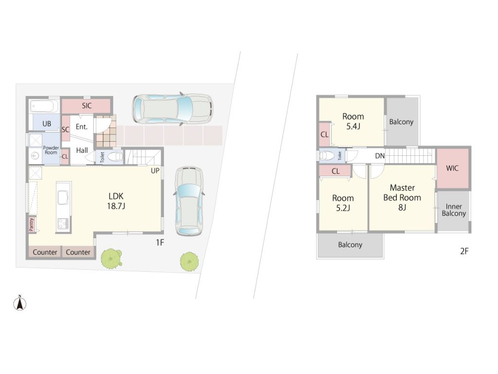 1号地は建築条件付土地、敷地面積約105㎡ 2号地は新築戸建で敷地面積約128㎡の2区画となります。2号地モデルハウス完成しました。ご見学予約を承ります。