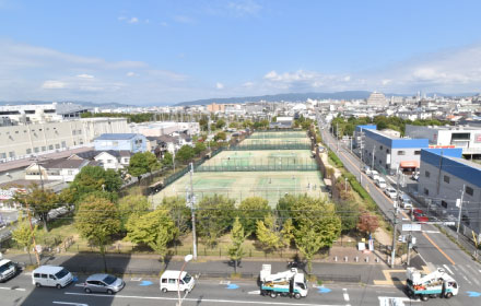 街区の東側には歩行者専用道路を挟んで「寿町公園」が隣接。豊かな緑の潤いの中で、小さなお子様も安心して遊んでいただけます。