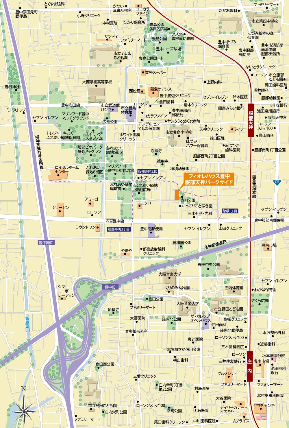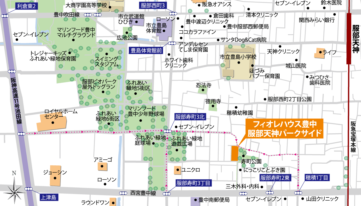 ※掲載の徒歩分数(概算距離)は1分を80mとして算出(端数切り上げ)したもので「フィオレハウス豊中服部天神パークサイド」境界から計測しております。