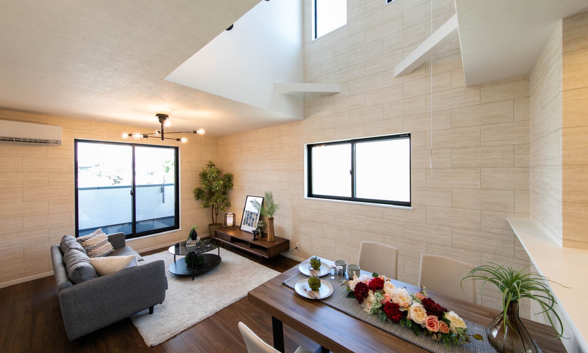 吹き抜けのリビング、ウッドデッキテラスなど、
