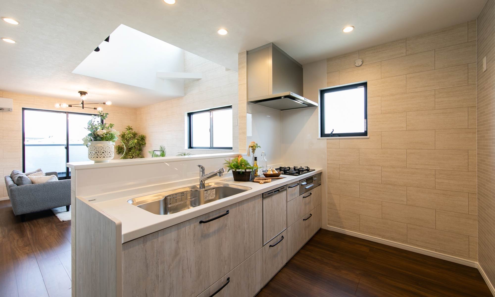- キッチンは冷蔵庫を隠して生活感を排除。大型収納もあるので、キレイを保ちます。