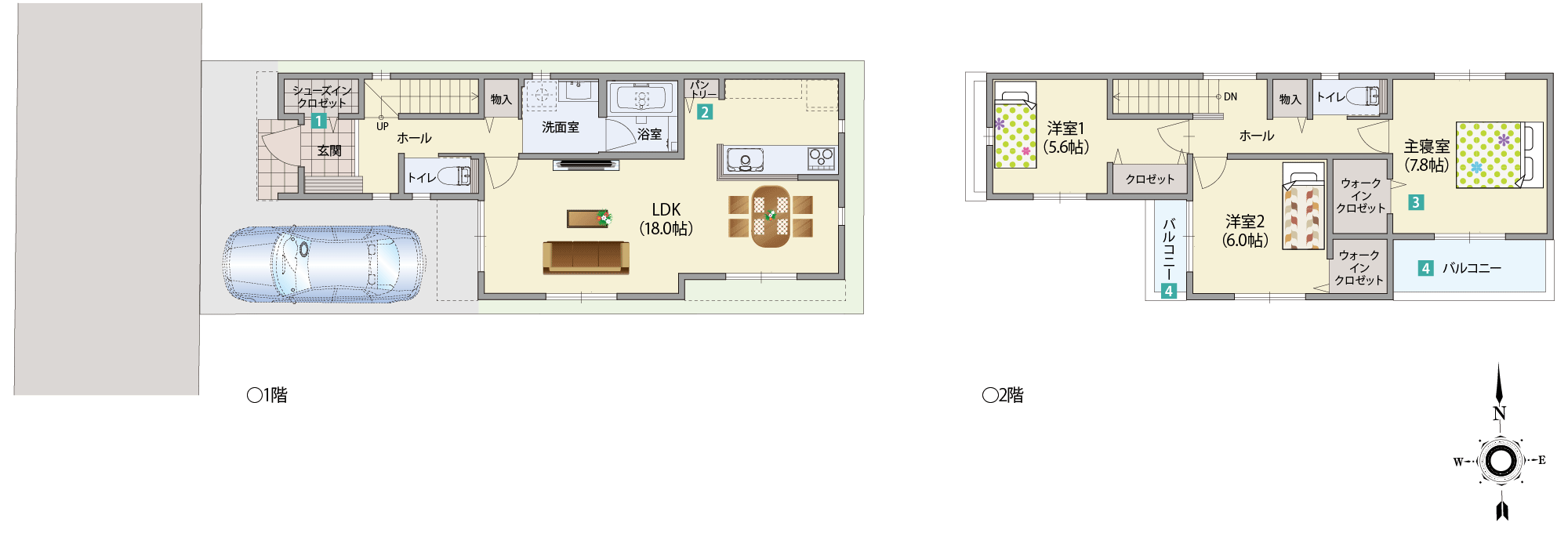 1階に主寝室、2階に3室を設けた4LDKプラン。