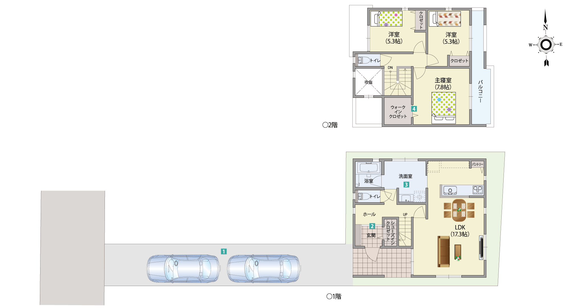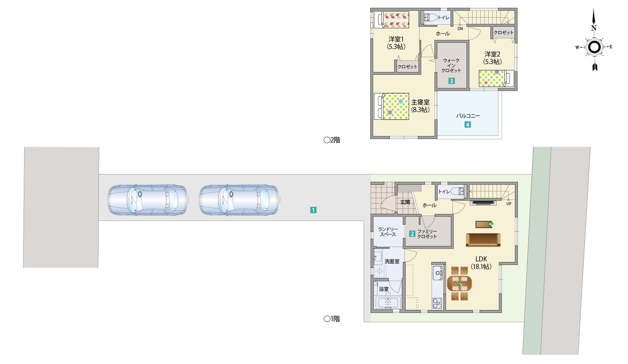 - 庭や駐車スペースのあるゆったりとした敷地や、リビングや水廻りを1階に集約して家事動線にも優れる2階建てプラン。1階には家族が集まるLDK、2階にはそれぞれのお部屋と機能性にも優れます。