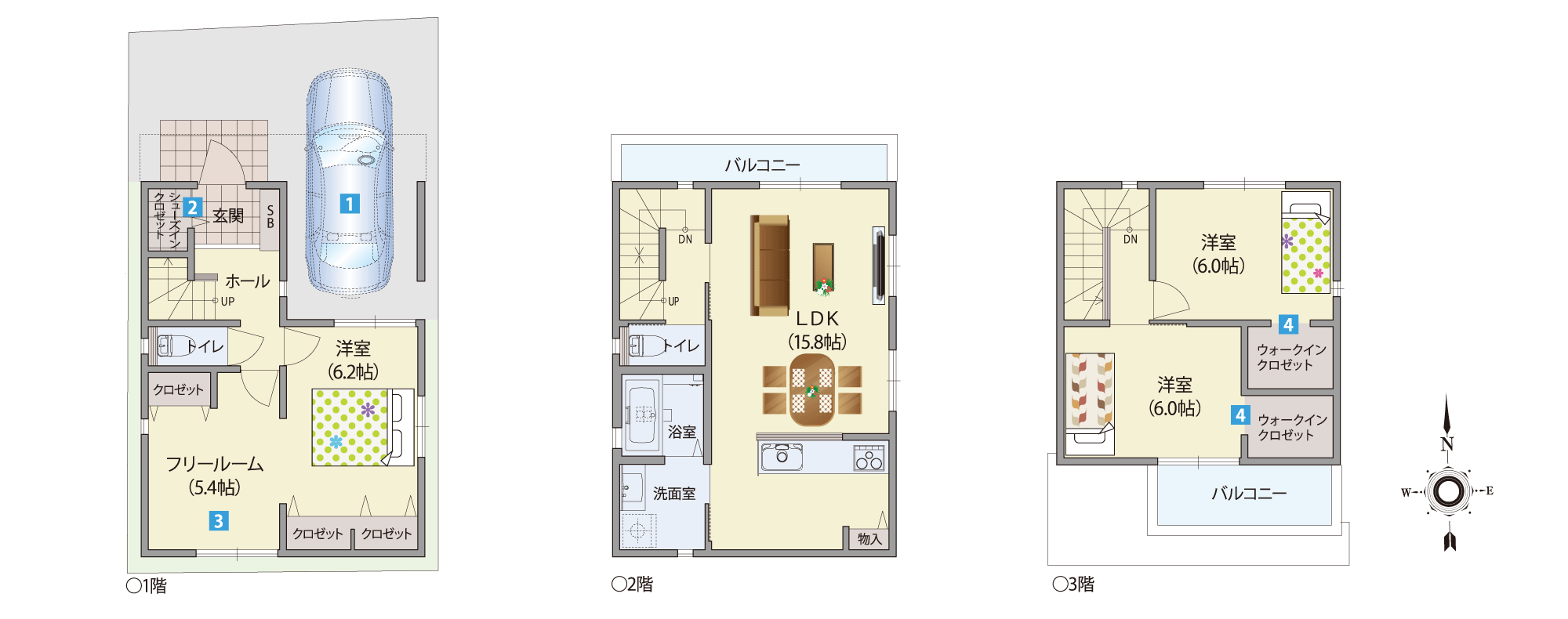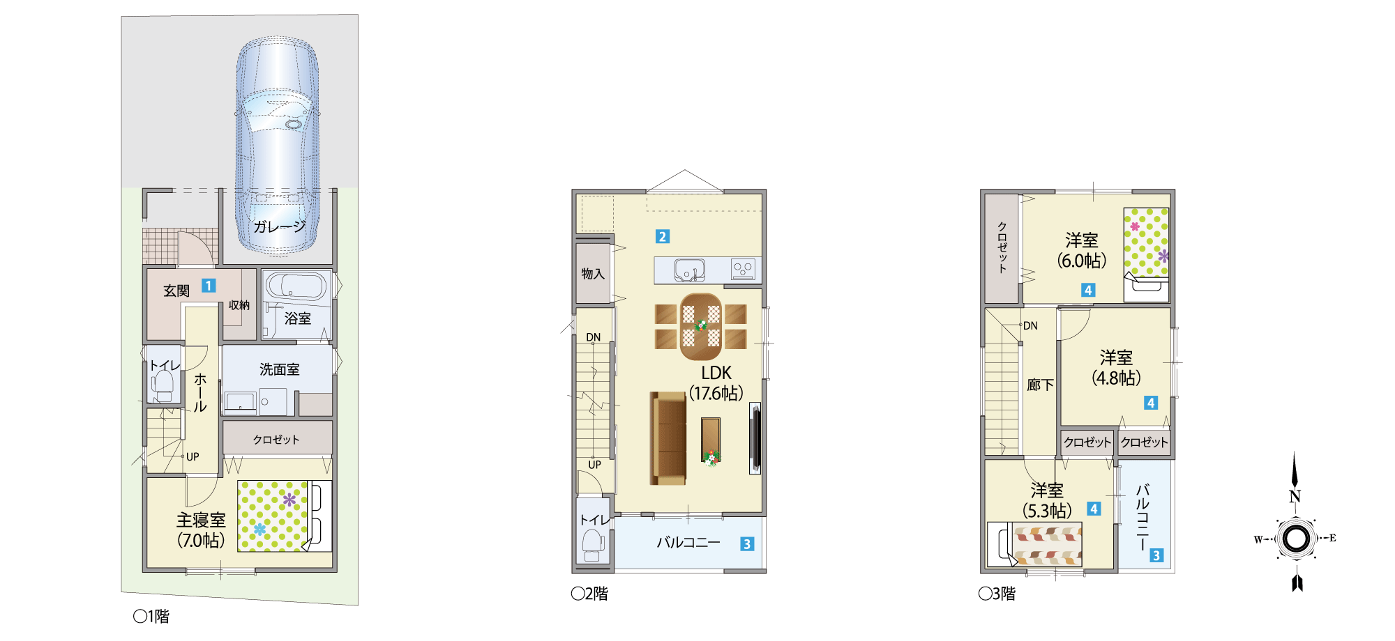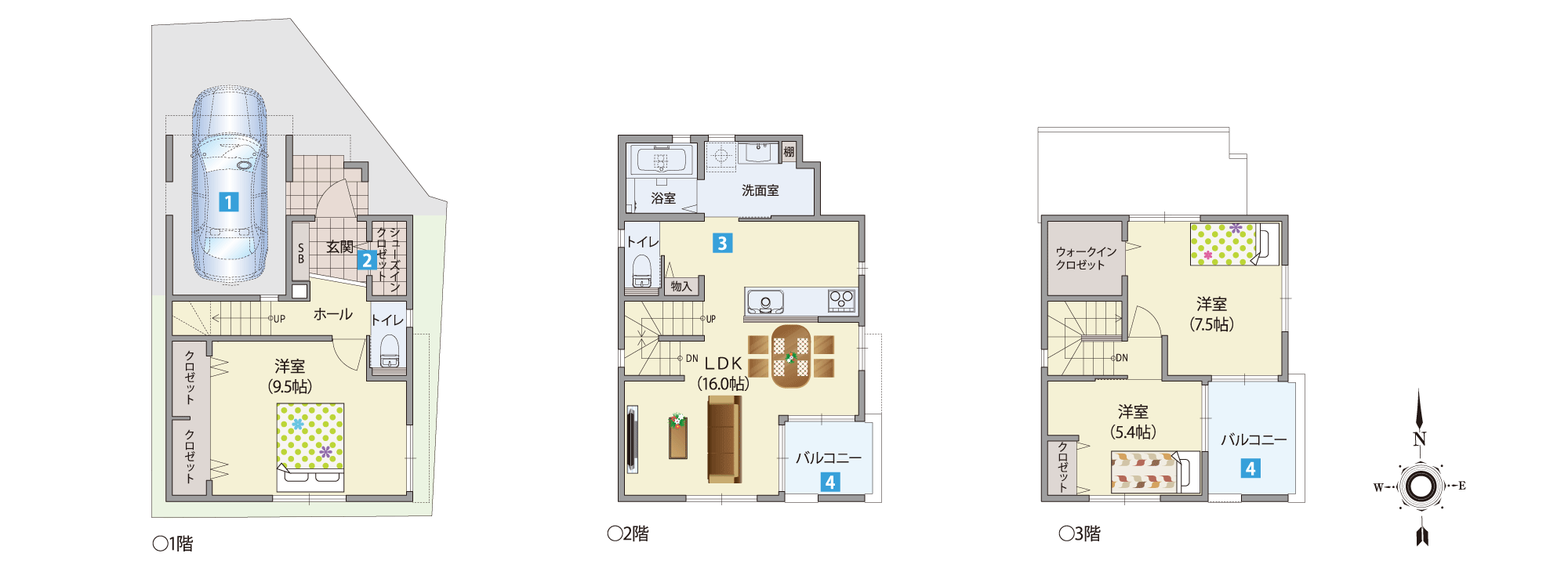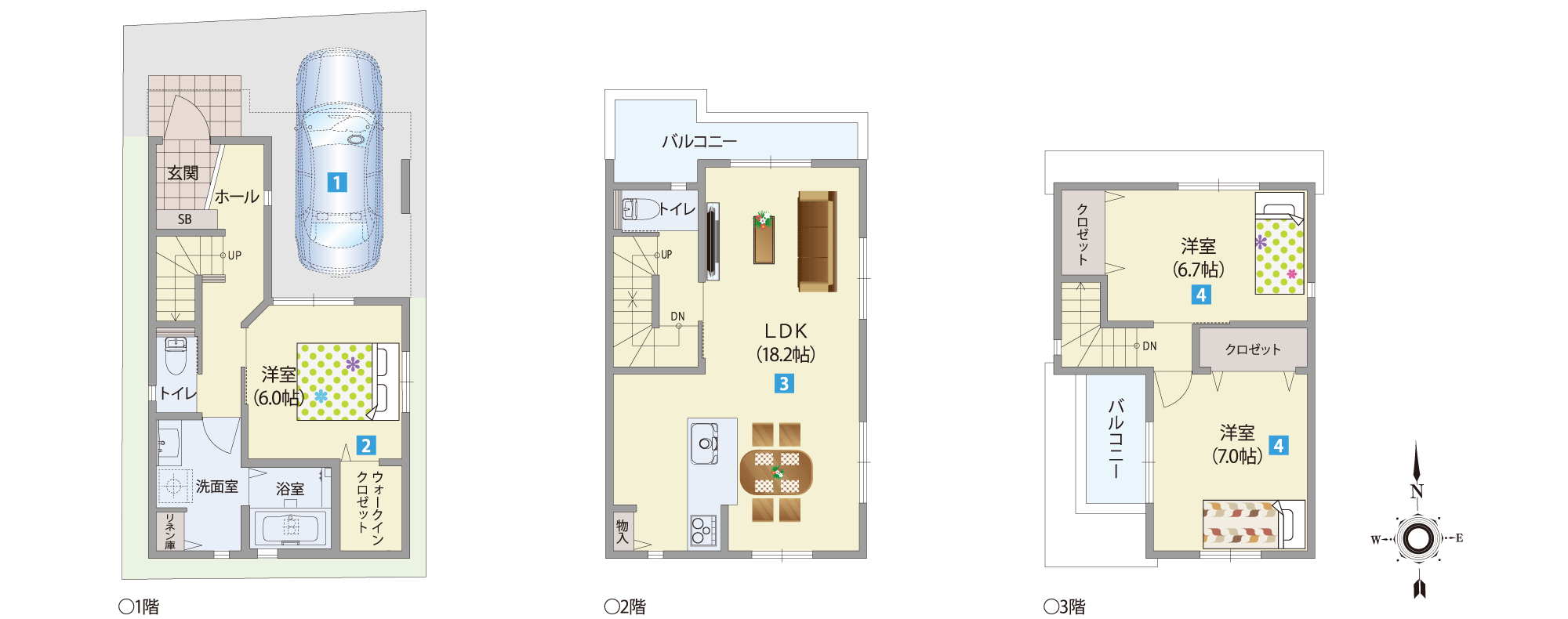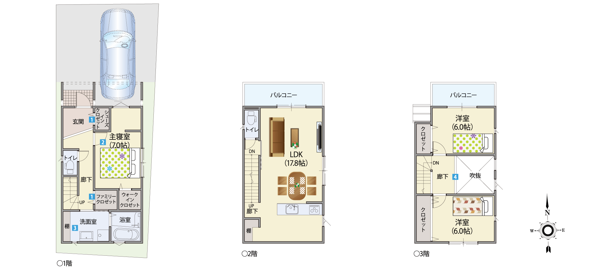 - 車や自転車が雨にも濡れにくいビルトインの駐車スペースや、明るく風通しの良い2階リビングが魅力の3階建てプラン。用途ごとにフロアを活用でき、各居室のプライバシーを高めます。
