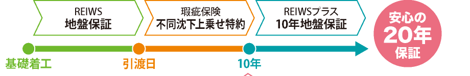 国土交通大臣の指定を受けた住宅瑕疵担保責任保険法人が展開する、不同沈下上乗せ特約保険とレイウスのREIWS保証とのコラボレーション。お施主様にとって最も大切なお引き渡しからの10年間は、民間の地盤保証ではなく、新築住宅瑕疵保険の不同沈下上乗せ特約を付帯しています。通常の不同沈下上乗せ特約ではカバーできていない、施工期間中の不同沈下リスクと、11年目以降の長期の不同沈下リスクはREIWS保証で対応します。