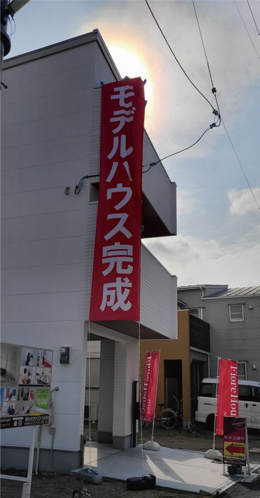 ご来場の際は、こちらの垂れ幕を目印にしていただければ幸いです。本分譲地も完売までまもなくです。マイホームをご検討中のお客様、まずはモデルハウスをご覧くださいませ。お車での送迎も可能です。ご予約の際に、お申し付けください。