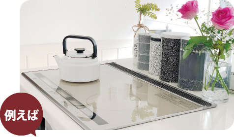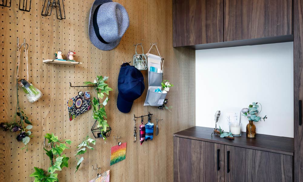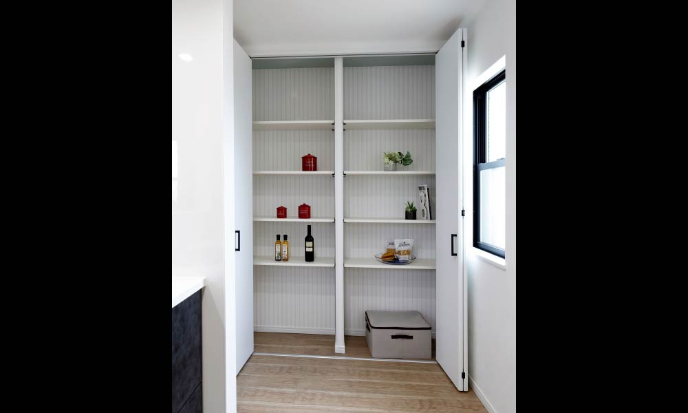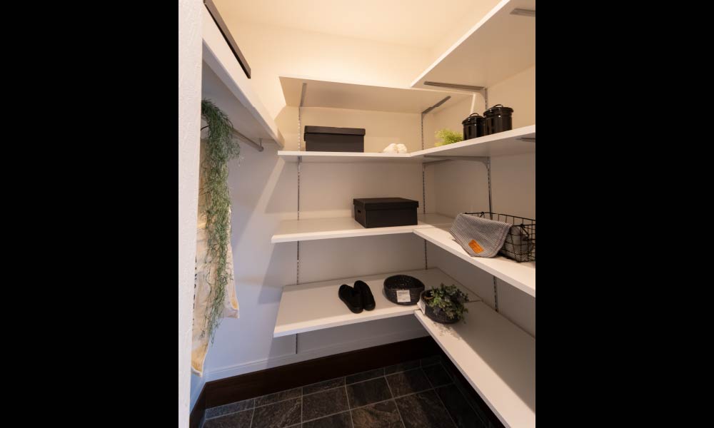 - キッチン横の壁面に設けたパントリーは、食品や飲料のストック、調理器具の収納に便利。