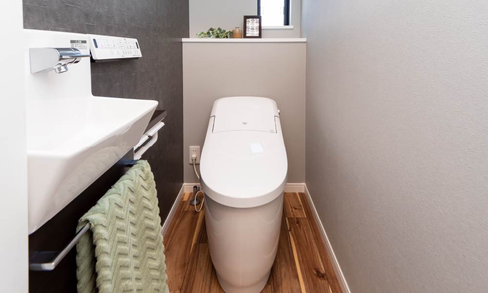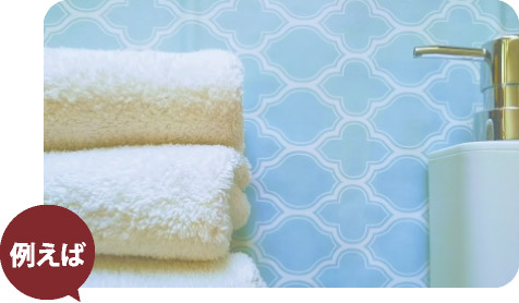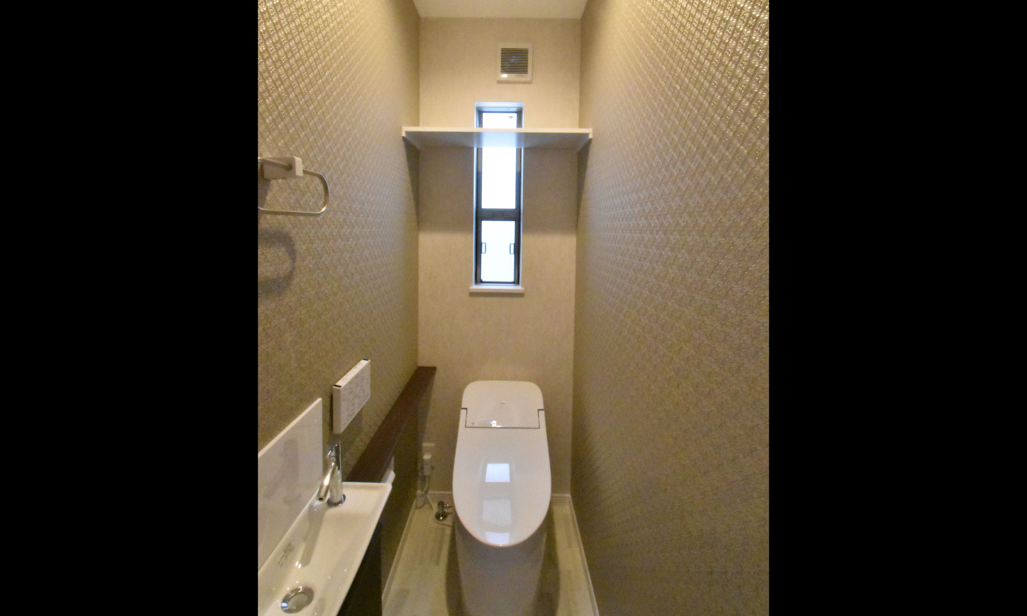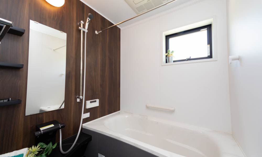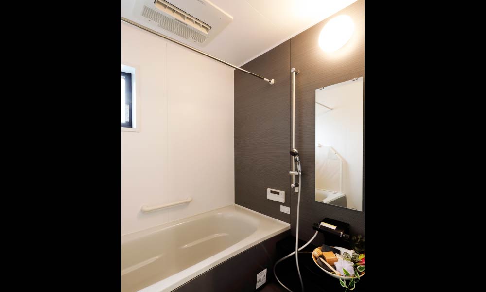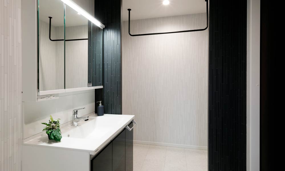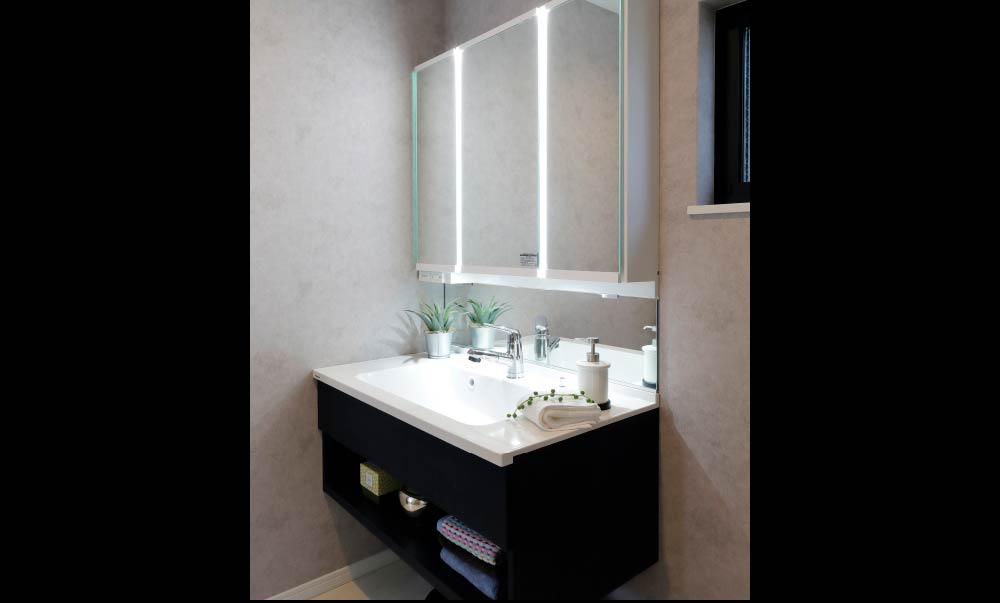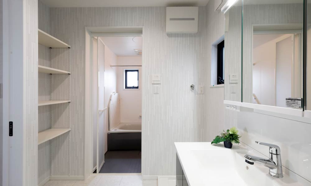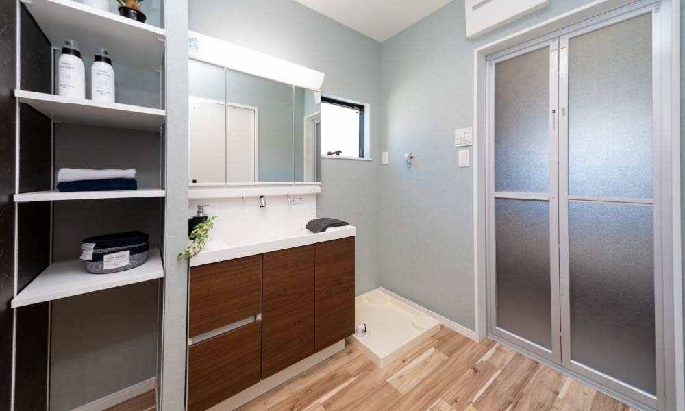 - 洗面室には、タオルやサニタリー用品などをすっきりと収納できる棚をご用意。