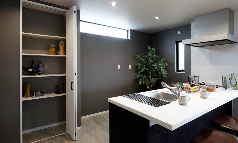 - オープンスタイルのキッチンには、食品のストックなどにも便利なパントリーを設置。