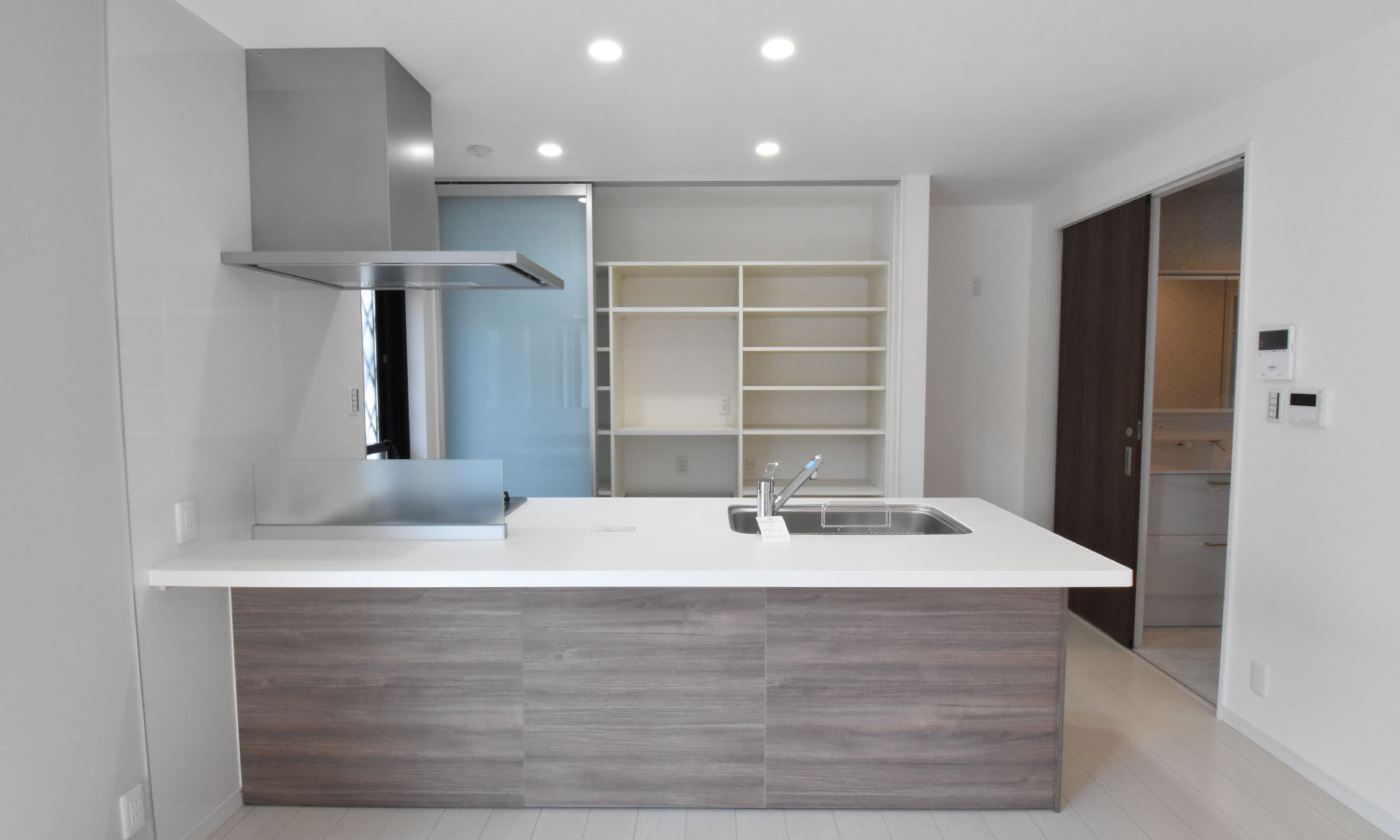 - 開放的な対面式のキッチンは、ダイニングや洗面室のある側とホール側の2方向へ出入り可能。