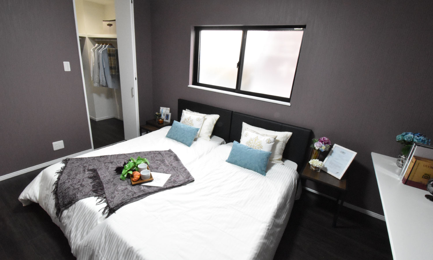 - 南と東の2面から光を採りこむ主寝室は、衣類をすっきりと収納できるウォークインクロゼットを設置。
